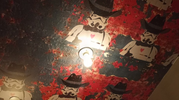 The women’s restroom at Press Play featured this amusing ceiling art. Considering the infamous inaccuracy of Stormtroopers, maybe this artwork be located in the men’s room instead.