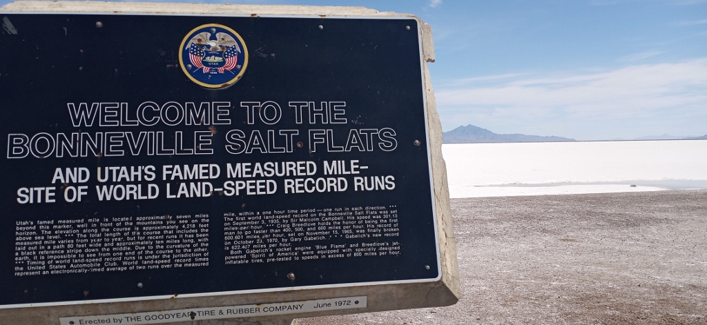 Just before hitting the Nevada border, we hit a rest stop… it turned out to be the Bonneville Salt Flats rest stop. What’s crazy about this if you’re driving west on Interstate 80, the rest stop signs are extremely unassuming… no mention of Bonneville. Yes, there’s a Bonneville Salt Flats Speedway sign AFTER you drive past the rest stop, but unless you have to use the facilities, you might very well drive by a missed opportunity.