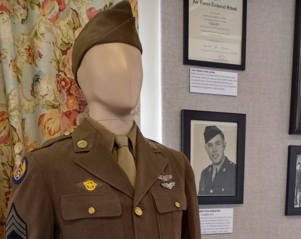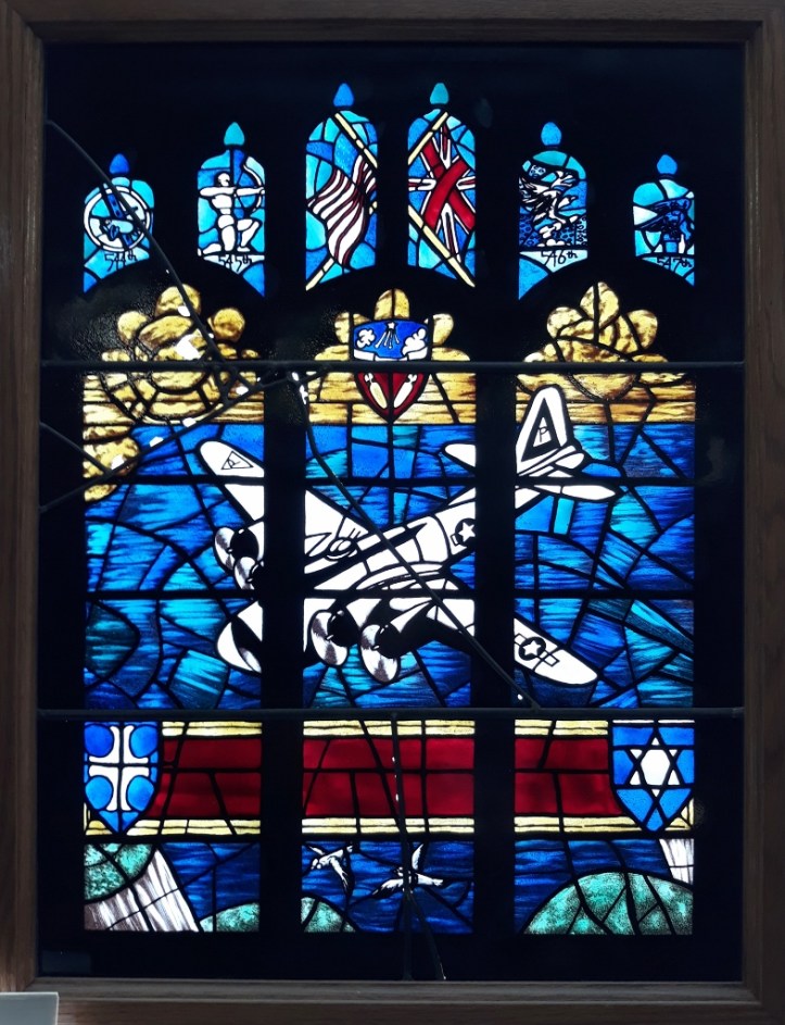 This stained glass depicts a B-17 from the 384th Bomb Group. The original is located in the Church of Saint James the Apostle in Grafton, England, the city where the group was based during their World War II campaign.